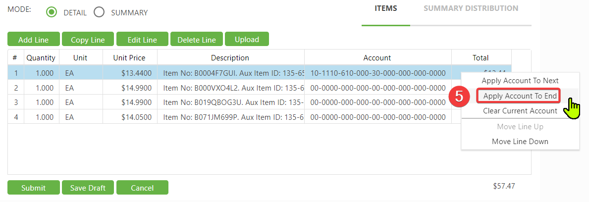 Right-click on the top item, and select Apply Account to End to apply the account code to all the other items