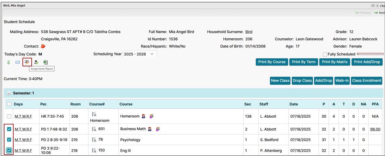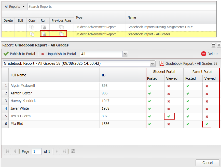 - Parents/Students that viewed the report will display a green checkmark in the "Viewed" column.