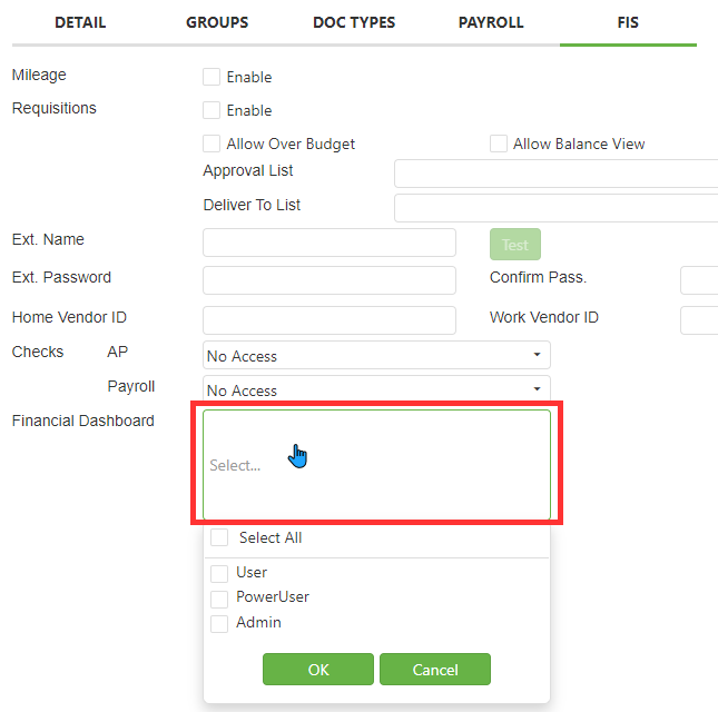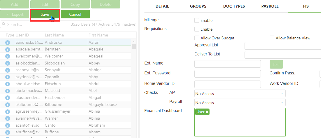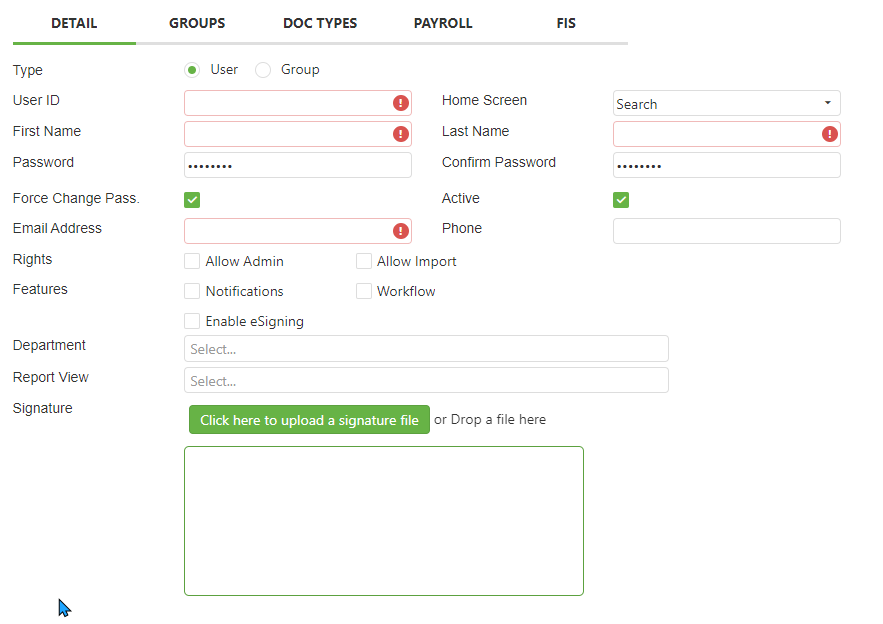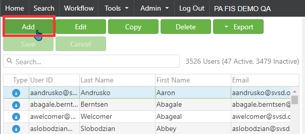 Enter a User ID, First Name, Last Name, default Password (whatever you want), Confirm Password (same as Password), and Email Address in the appropriate fields.