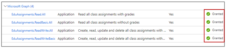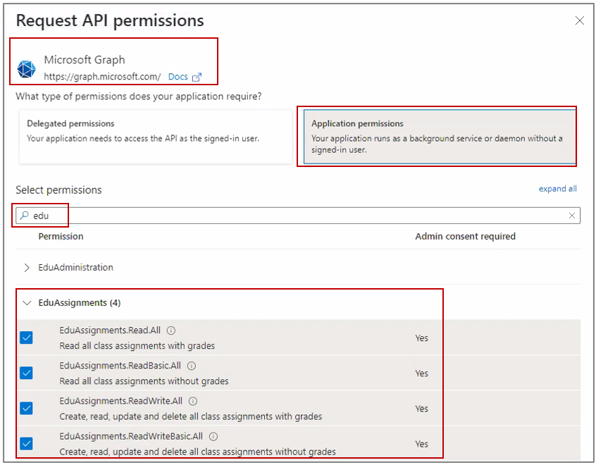 - Select the all options under EduAssignments - Read.All, ReadBasic.All, ReadWrite.All, ReadWriteBasic.All).