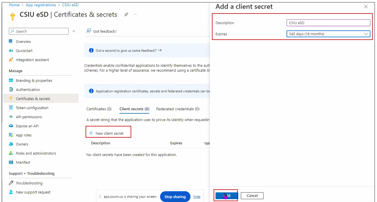 - Copy the Client Secret for entery into eSD.