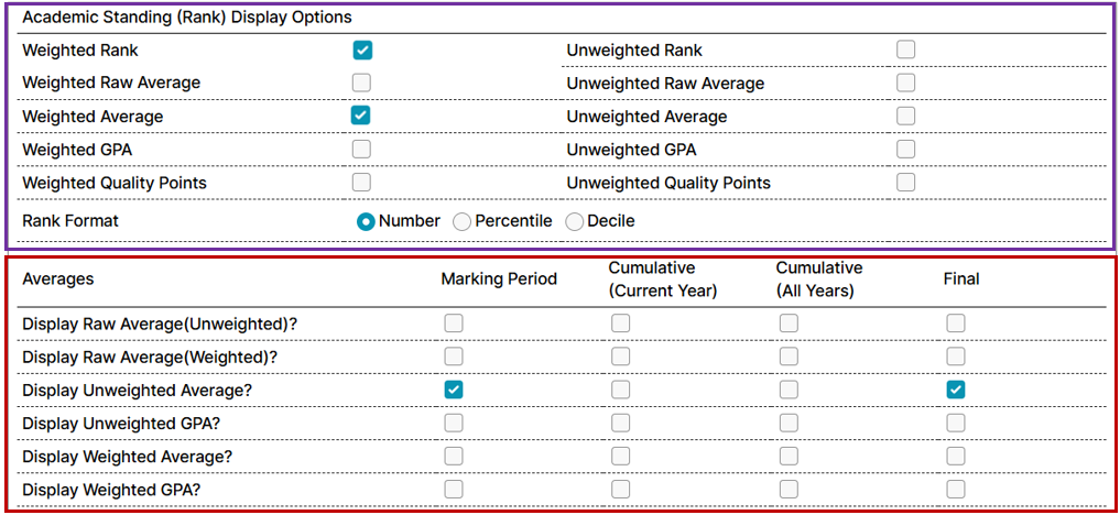 - For a true cumulative average use the average options from the Academic Standing (Rank) Display Options.