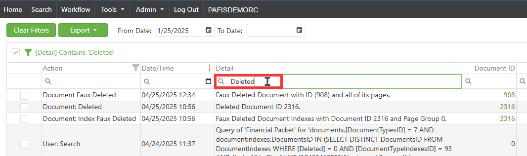 TIP: Use the filter options. Example: Enter 'Deleted' in the Detail column to bring up a list of documents that have been deleted from the SCView system.
