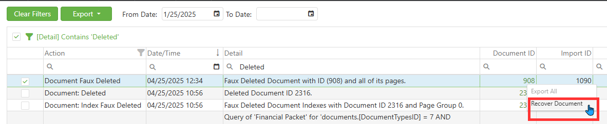 3. Right click on the Document ID and select Recover Document option. This restores the document and you should be able to locate it in the Search area again.