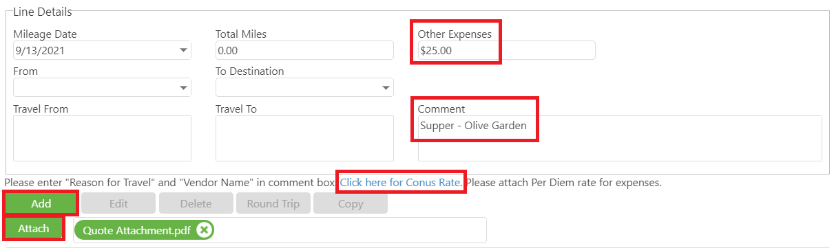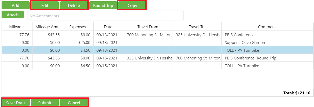 Select an expense and utilize the Edit, Delete, or Copy to edit or update additional reimbursement expenses.