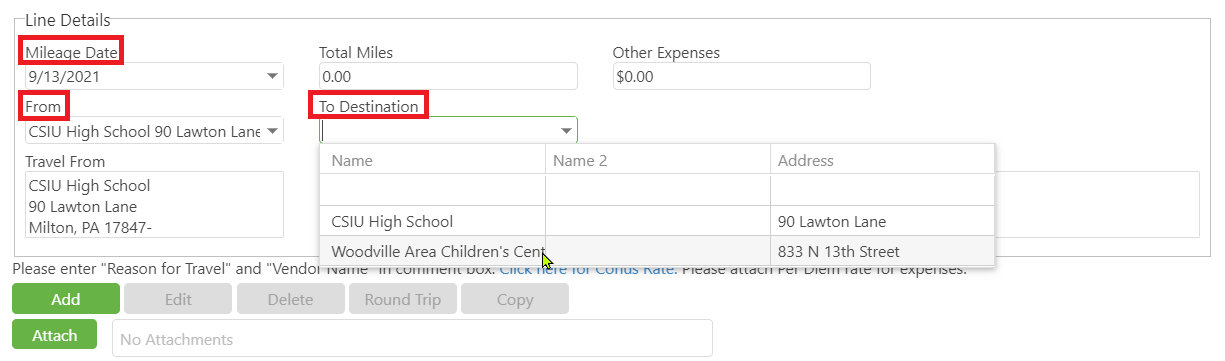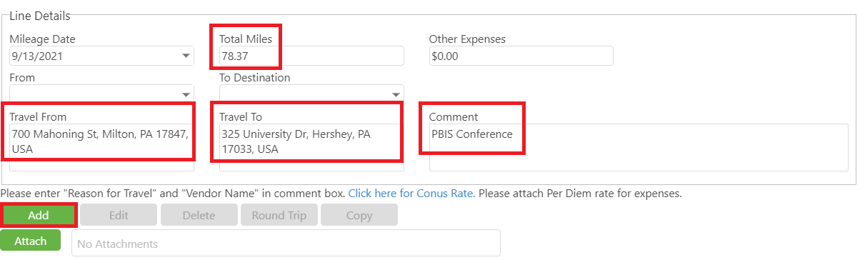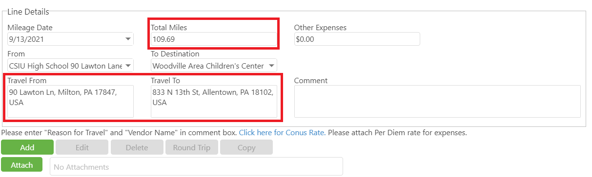 Total Miles – calculates automatically based on locations entered into the Travel From and Travel To fields