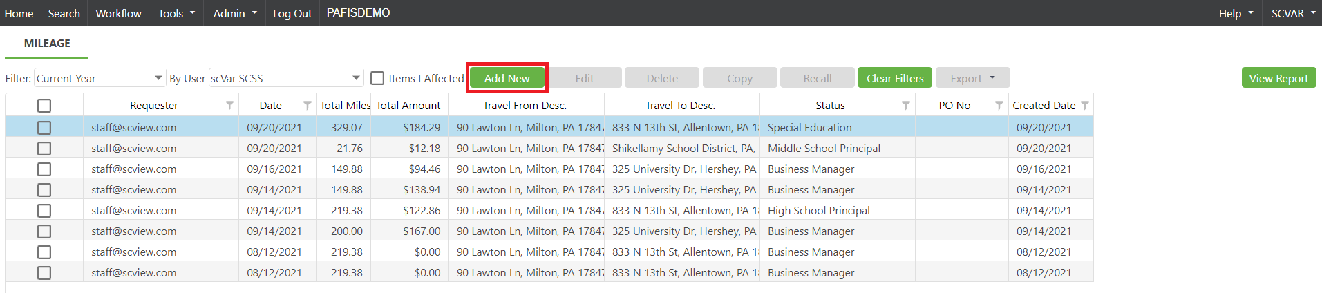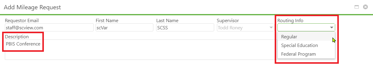 Requestor Email, First Name, and Last Name will default to the user entering the Mileage request.