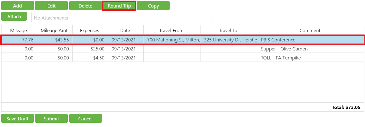 highlight the mileage reimbursement and select Round Trip to automatically calculate return mileage