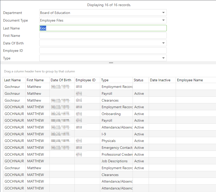For Example, you have a staff with a last name of Gochnaur. You know the first few letters begin with 'GOC' but are unsure of the rest of the spelling. Enter Goc in your name search field and click the search button. The system will bring up any employee with those first few letters.